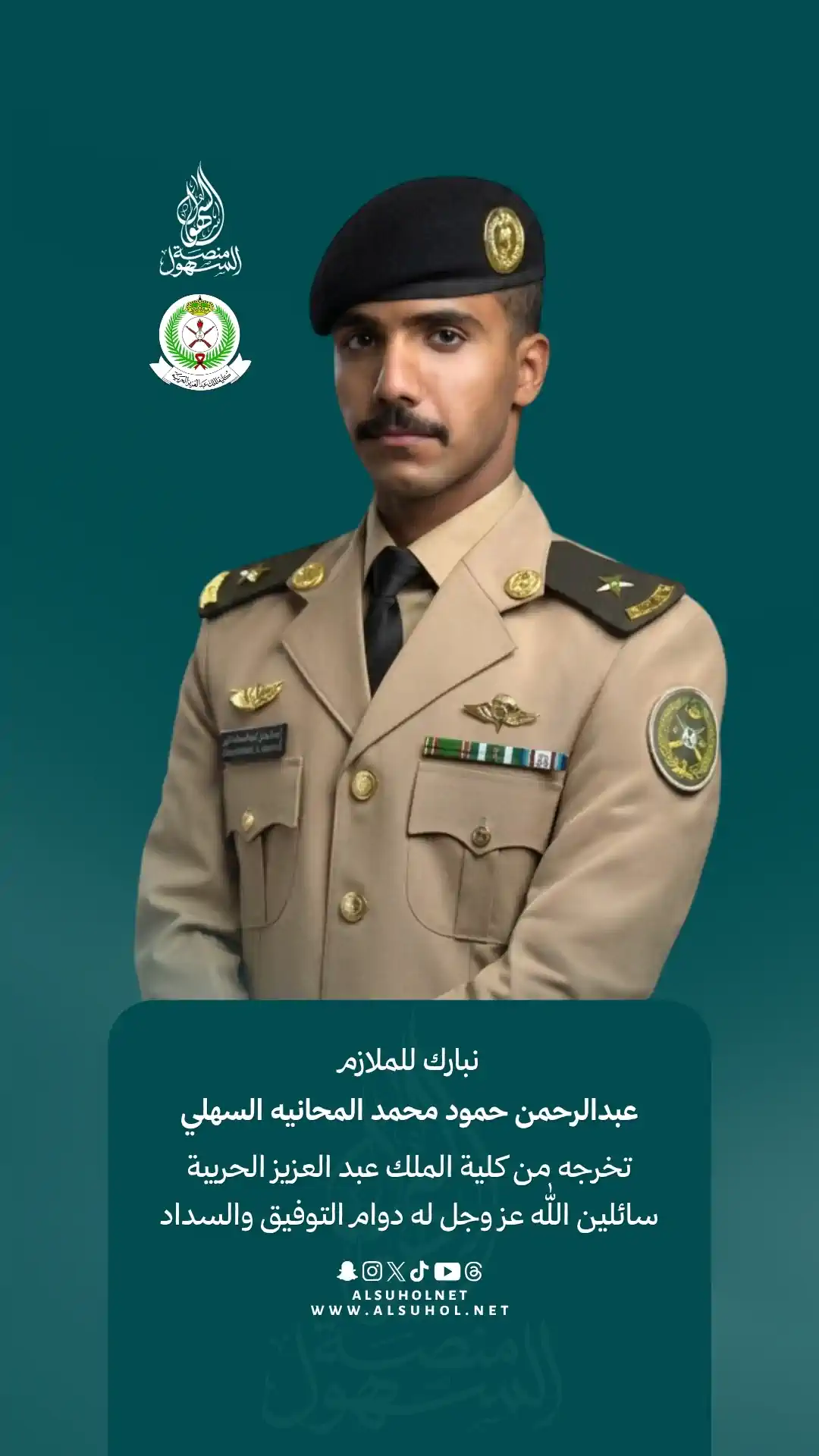 نبارك للملازم عبدالرحمن حمود محمد المحانيه السهلي تخرجه من كلية الملك عبد العزيز الحربية سائلين اللّٰه عز وجل له دوام التوفيق والسداد