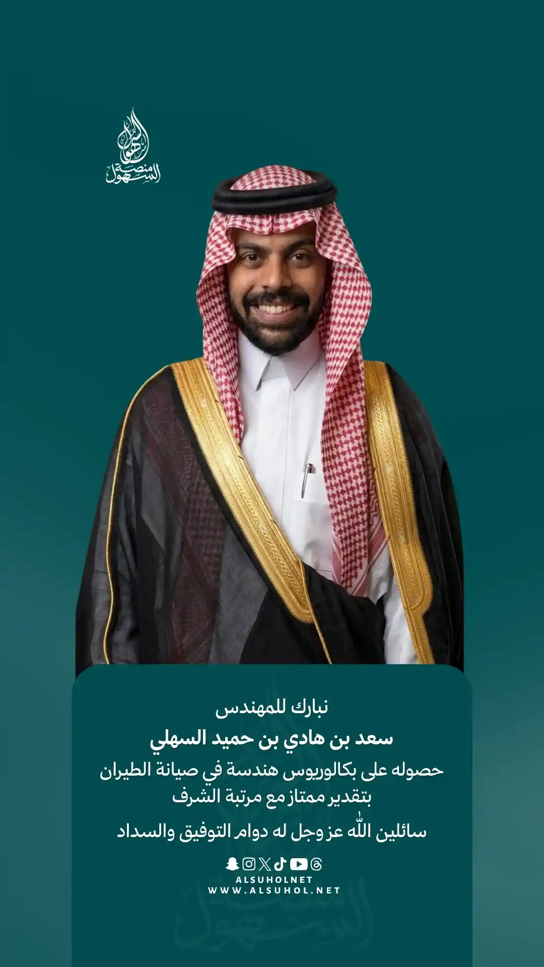 نبارك للمهندس سعد بن هادي بن حميد السهلي حصوله على بكالوريوس هندسة في صيانة الطيران بتقدير ممتاز مع مرتبة الشرف، سائلين اللّٰه عز وجل له دوام التوفيق والسداد.